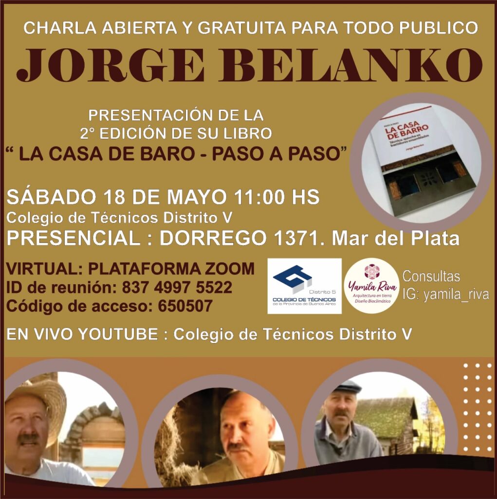 El sábado 18 de Mayo, de 11 a 13 hs, estará JORGE BELANKO, constructor natural de amplia trayectoria, brindando una charla abierta y gratuita en la sede central del Colegio de Técnicos Distrito V y presentando la 2° edición de su libro «LA CASA DE BARRO – PASO A PASO».