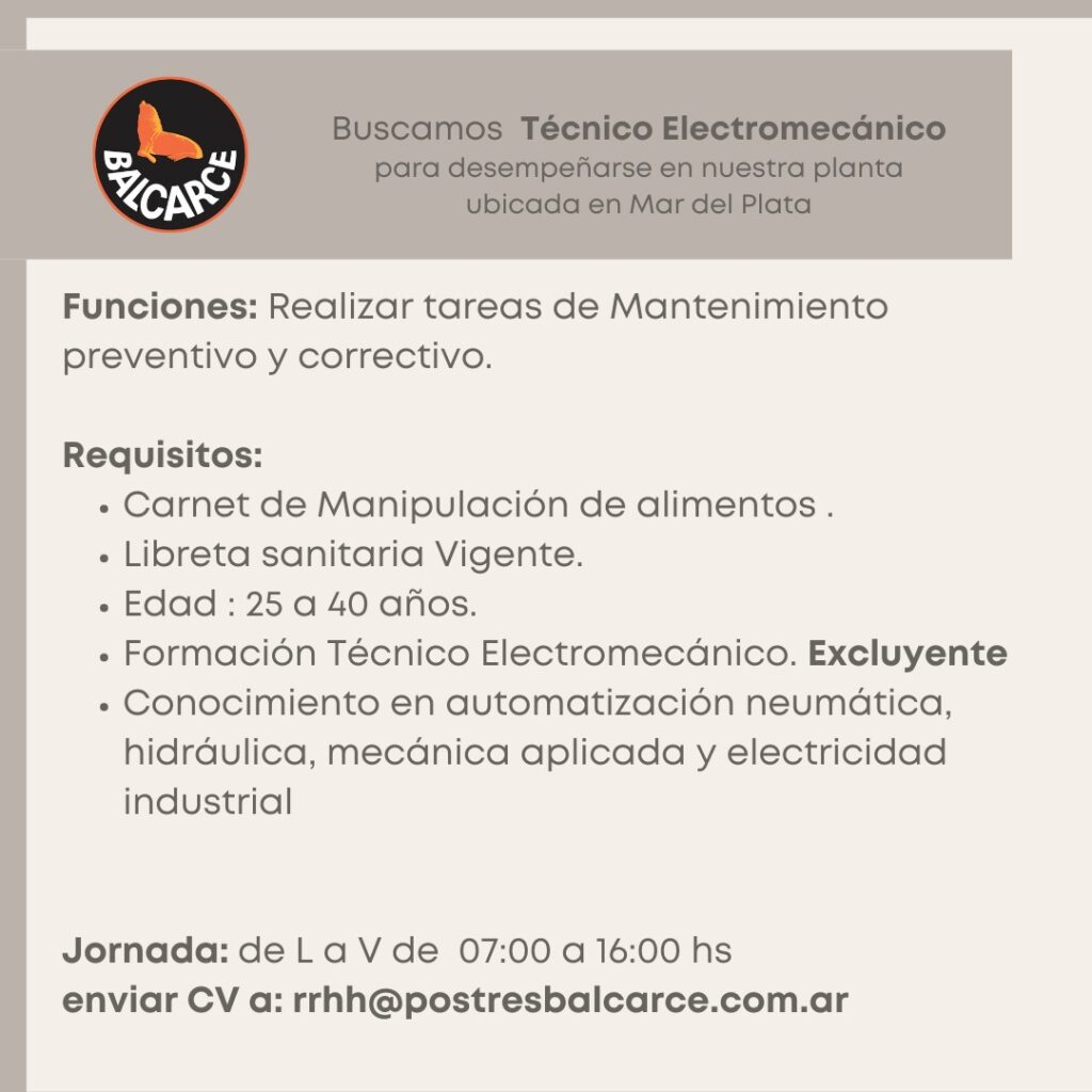 La empresa Balcarce busca Técnico Electromecánico para desempeñarse en su planta ubicada en Mar del Plata.