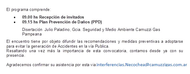 El jueves 24 de abril, a las 9 hs, se realizará una Charla sobre el Plan de Prevención de Daños sobre Instalaciones de Gas Natural en la Vía Pública a cargo de Camuzzi Gas Pampeana S.A.